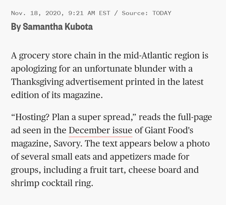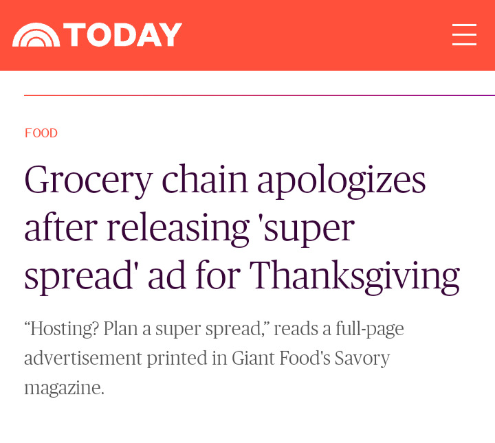 For generations that had never experienced a pandemic, the Coronavirus was not the only novel thing to adjust to. New nomenclature became the norm, including "Super spreader". The term was used to describe large groups gathering, especially during the holidays. Any other year, "plan a super spread" would be understood as a spread of food items. But for a population that was being restricted from large gatherings, in 2022, from holidays to Weddings to funerals, the company's attempt at clever advertising came off as tone-deaf and offensive. After backlash, Giant Food Stores formally apologized.