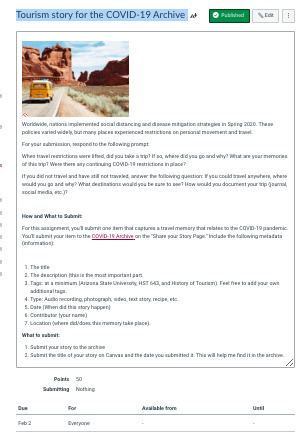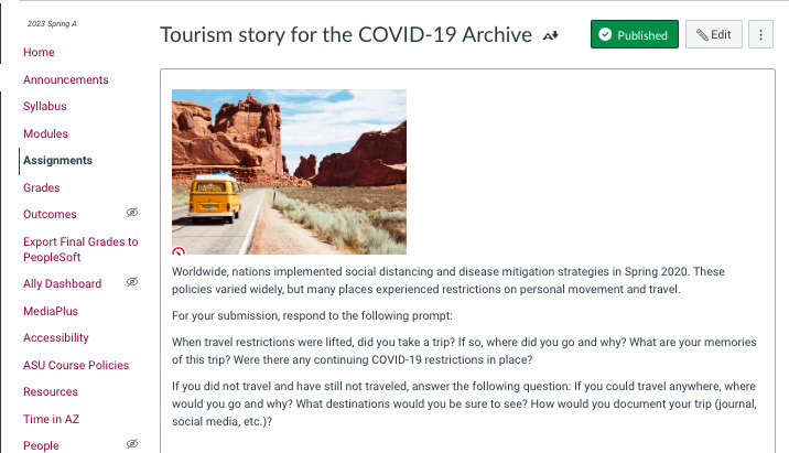 Tags: at a minimum (Arizona State University, HST 643, and History of Tourism). Feel free to add your own additional tags.