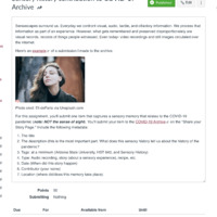 For this assignment, you'll submit one item that captures a travel memory that relates to the COVID-19 pandemic. You'll submit your item to the COVID-19 Archive Links to an external site.on the "Share your Story Page." Include the following metadata (information):
