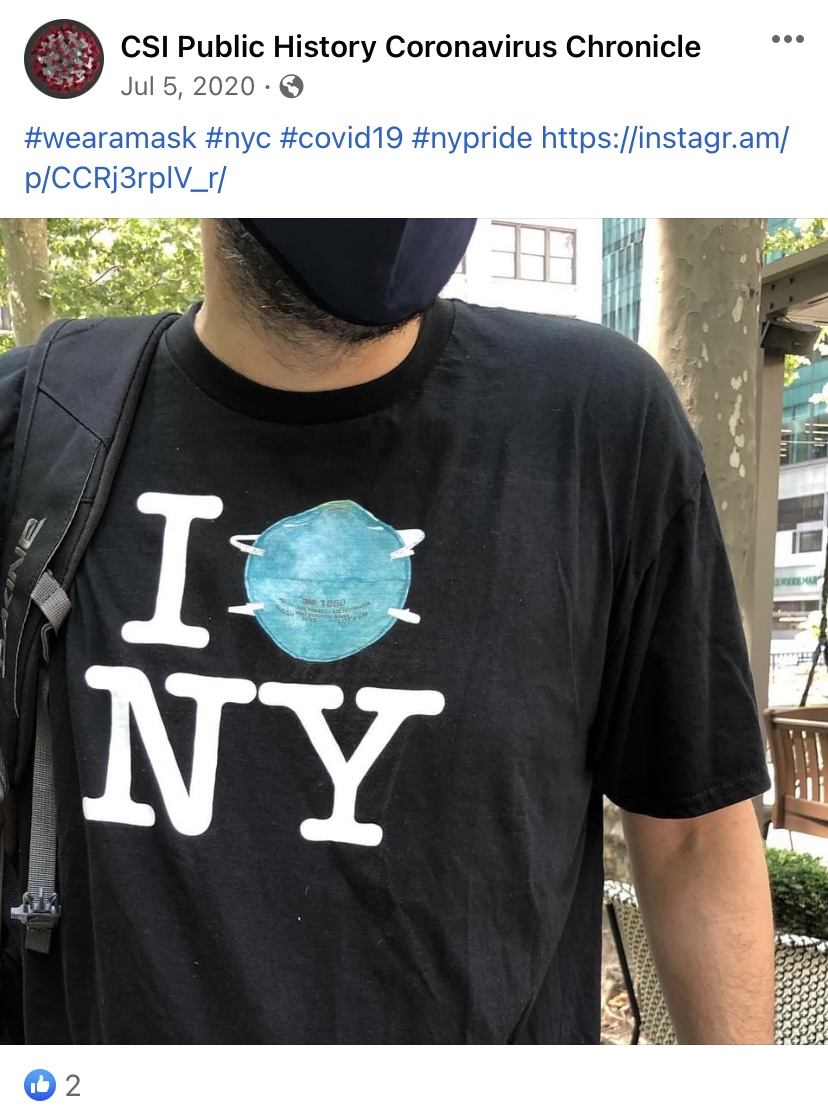 Screenshot of a wear a mask shirt from the CSI Public History Coronavirus Chronicle Facebook page
