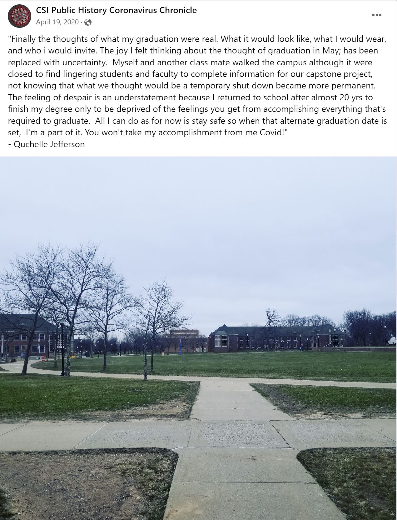 "Finally the thoughts of what my graduation were real. What it would look like, what I would wear, and who i would invite. The joy I felt thinking about the thought of graduation in May; has been replaced with uncertainty. Myself and another class mate walked the campus although it were closed to find lingering students and faculty to complete information for our capstone project, not knowing that what we thought would be a temporary shut down became more permanent. The feeling of despair is an understatement because I returned to school after almost 20 yrs to finish my degree only to be deprived of the feelings you get from accomplishing everything that's required to graduate. All I can do as for now is stay safe so when that alternate graduation date is set, I'm a part of it. You won't take my accomplishment from me Covid!"