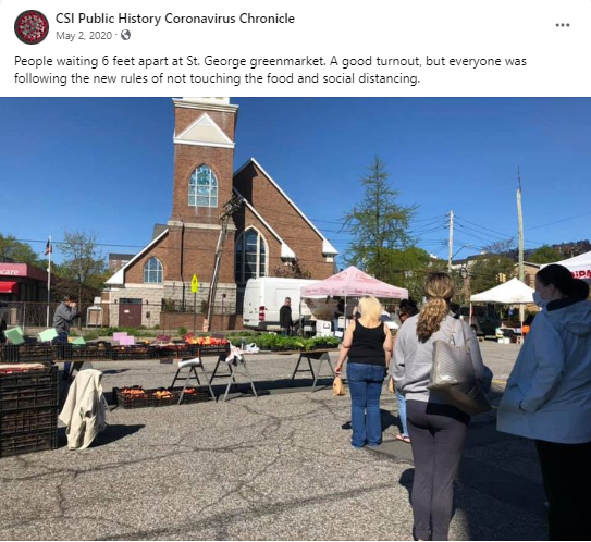 People waiting 6 feet apart at St. George greenmarket. A good turnout, but everyone was following the new rules of not touching the food and social distancing.