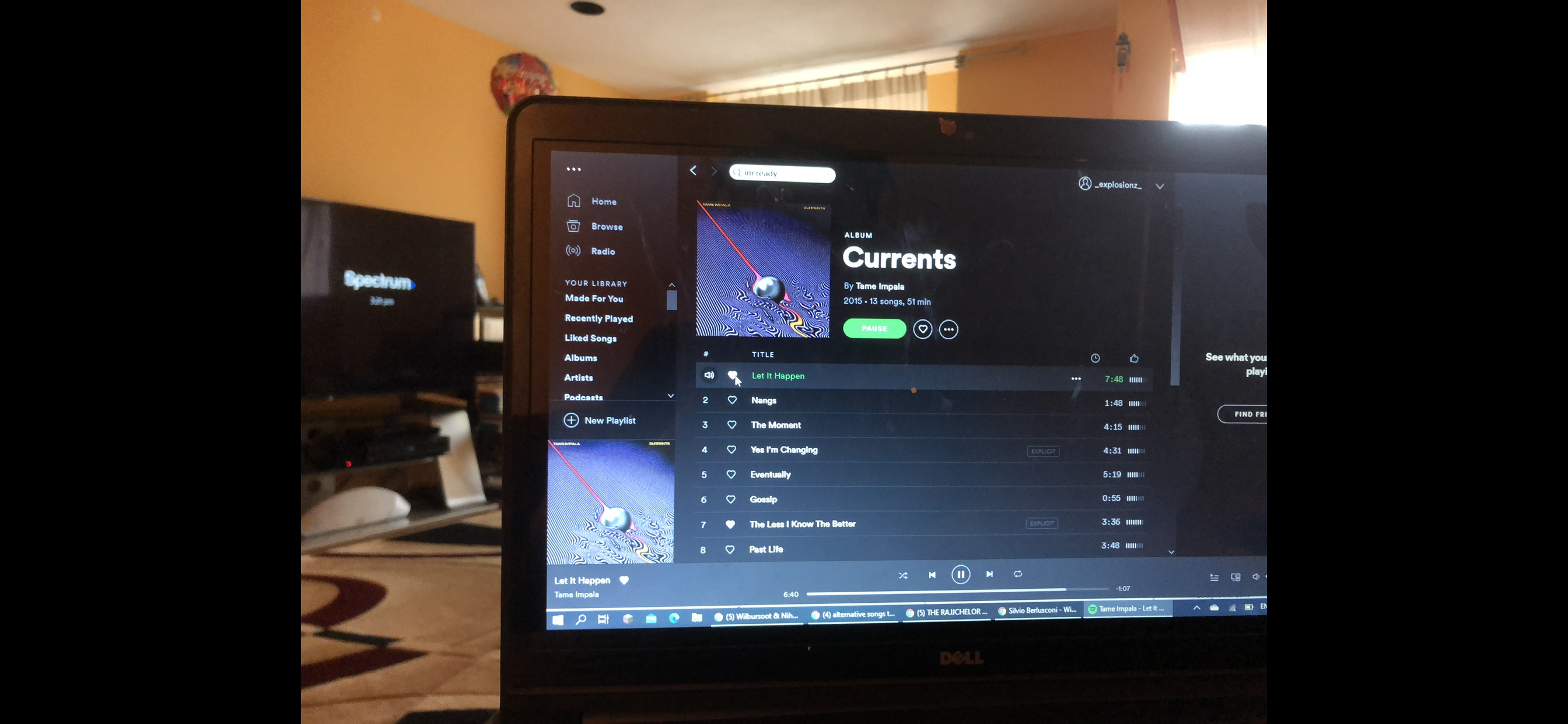 During the COVID-19 lockdown, I was bored. I started to listen to an unprecedented amount of music. Including music from the artist Tame Impala. This photo shows me listening to his “Currents” album via Spotify. Currents is now one of my favorite albums of all time. Everytime I listen to a song from it, I think back to 2020 and as a result, that time holds a sentimental value to me.