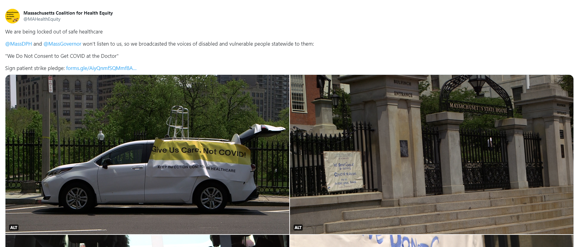 With the designation of COVID-19 as a "public health emergency" by the Centers for Disease Control and Prevention (CDC) ending as of May 11, 2023, public healthcare facilities throughout the US are rolling back protections they once employed to try to keep people safer during this ongoing pandemic. So, as this unit asks of us students, are pandemics the “great equalizers” in terms of social inequalities, and is there more equality now that the "emergency" has been deemed to be over? I argue that this is not the case, as immune compromised and disabled people have been more or less left for dead. A huge swath of healthcare facilities have removed mask mandates for care providers and hospital visitors, which leaves vulnerable and immune compromised people at a much higher risk of getting COVID-19 while receiving the medical care that is necessary for them to manage their conditions. In response, people and organizations, such as the Massachusetts Coalition for Health Equity in the tweet above, have begun to mobilize in favor of maintaining COVID-19 protections in healthcare settings by organizing strikes, protests, petitions, and phone banks to public officials.