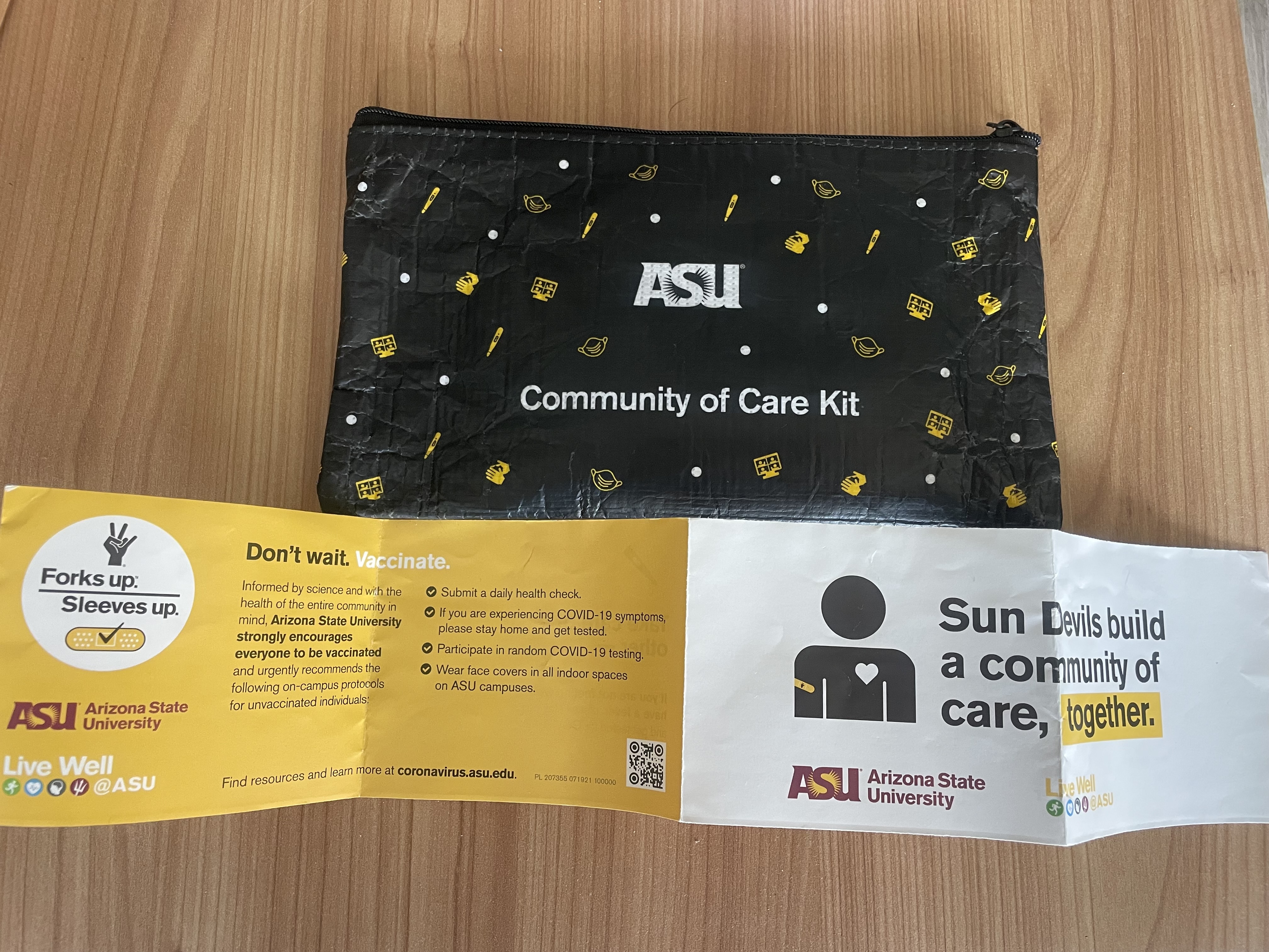 Yesterday during class, I was rummaging through my backpack when I found this Community of Care Kit that I was given in the Fall 2021 semester of my freshman year at Arizona State University. As of now, I am in my last semester at ASU and can't help to feel bittersweet when looking to the past. My last two years of high school and first semester of college were defined by the COVID-19 pandemic, and now the world has seemed to returned to normalcy. I'm glad that I still have this Community of Care Kit as it holds much historical significance in showing what life was like during the pandemic. On a personal level, this kit reminds me of a time that seems so different to what life is like now, and it also holds strong memories of my first year of college. Five years later, I now look at the COVID-19 pandemic and recognize the positives it brought, such as spending more time with my family and growing into young adulthood during this time.