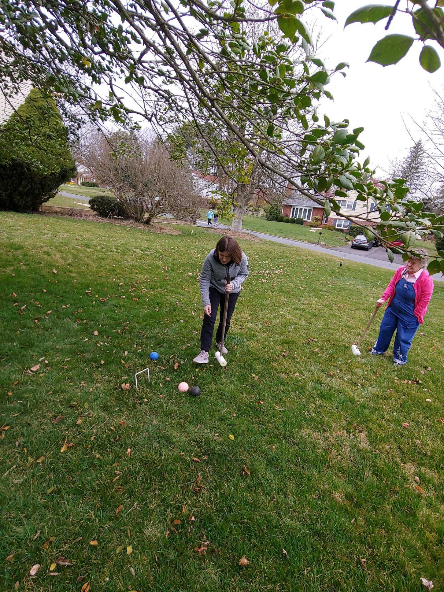 Two women are photographed on a large lawn playing a game of croquet. One is reaching for a ball, while another watches from the background.