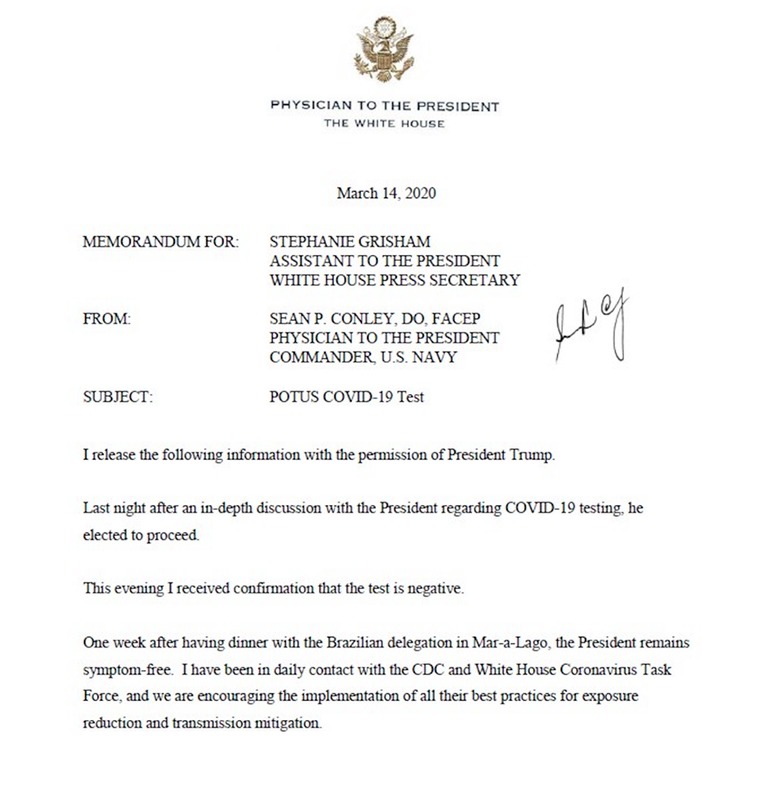 President Trump's doctor releases a statement saying that the President has tested negative for CoVid-19
