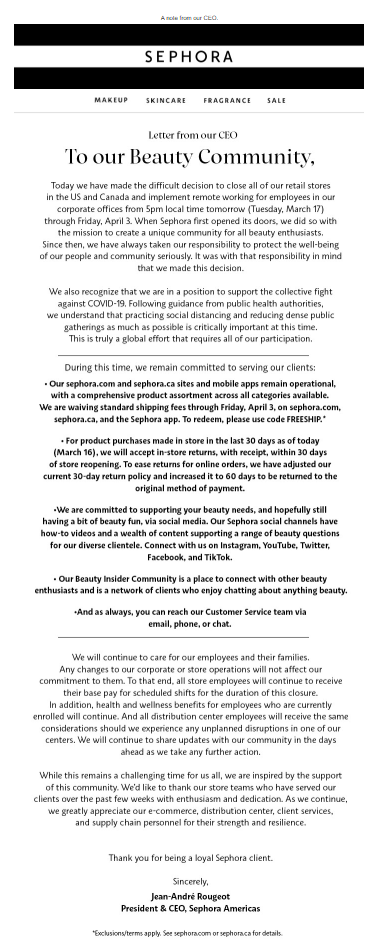 Email notification from Sephora Beauty announcing the closure of all retail stores in the United States and Canada, effective 17 March 2020. This is one of a number of other personal hygiene and cosmetics companies announcing similar closures.