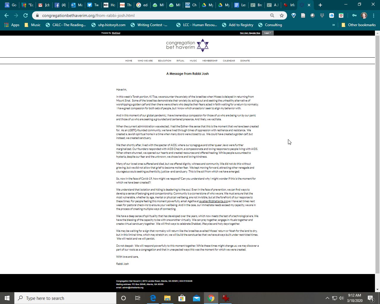 This message was posted by Rabbi Joshua Lesser of Congregation Bet Haverim in Atlanta, Georgia, a Reconstructionist synagogue founded by LGBTQ+ Jews in the 1980s, during the AIDS epidemic. The message offers spiritual guidance and grounding in the synagogue's history of compassion toward people who were marginalized during the HIV epidemic that ravaged and stigmatized the Gay community at the time of the synagogue's founding.