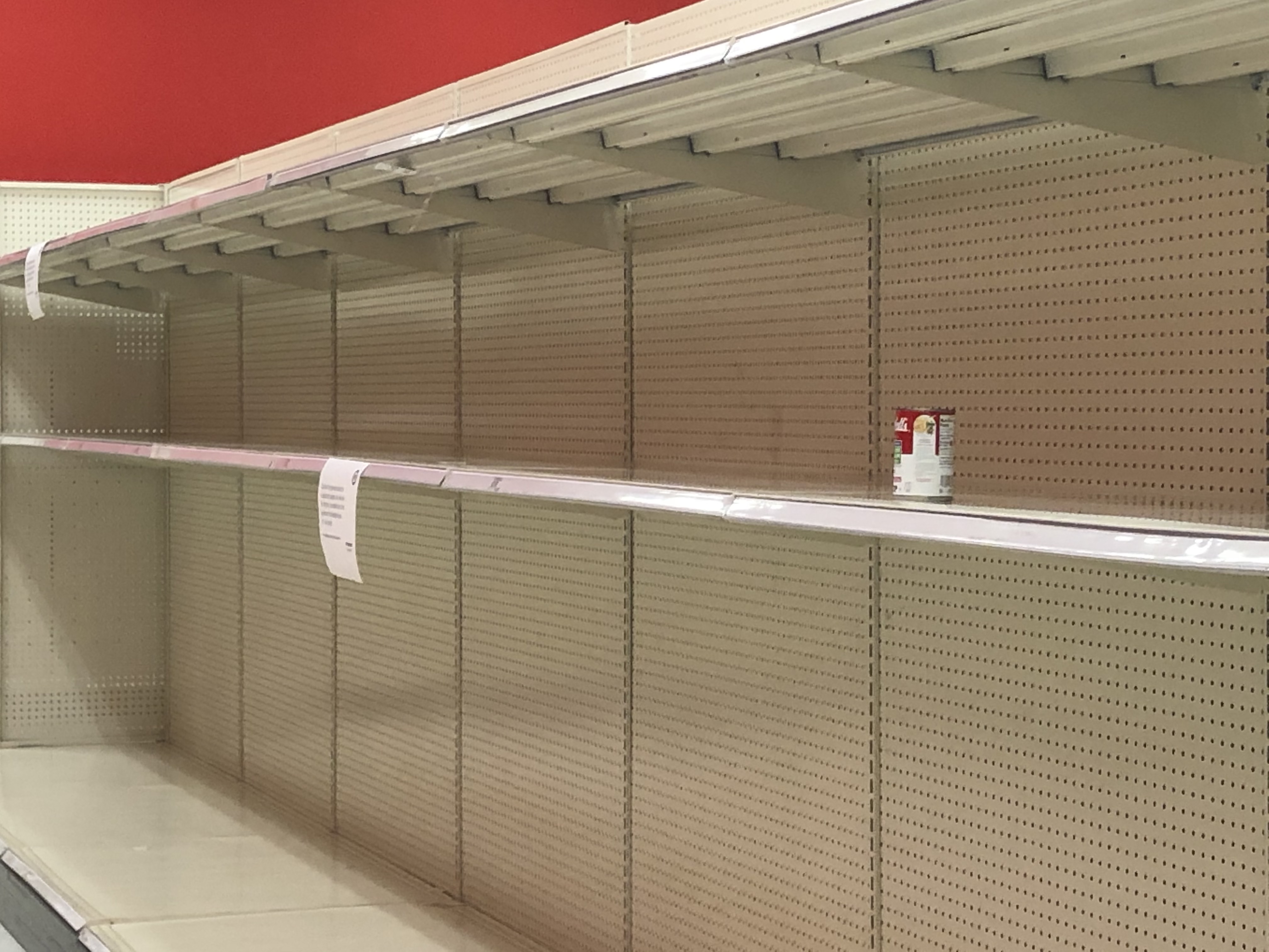 The empty shelves at Target where toilet paper usually is... and a lone can of wayward soup.