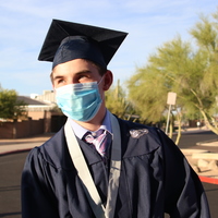 A young man sitting at a kitchen counter attending a virtual orientation for University.Online Orientation Linked Data Image