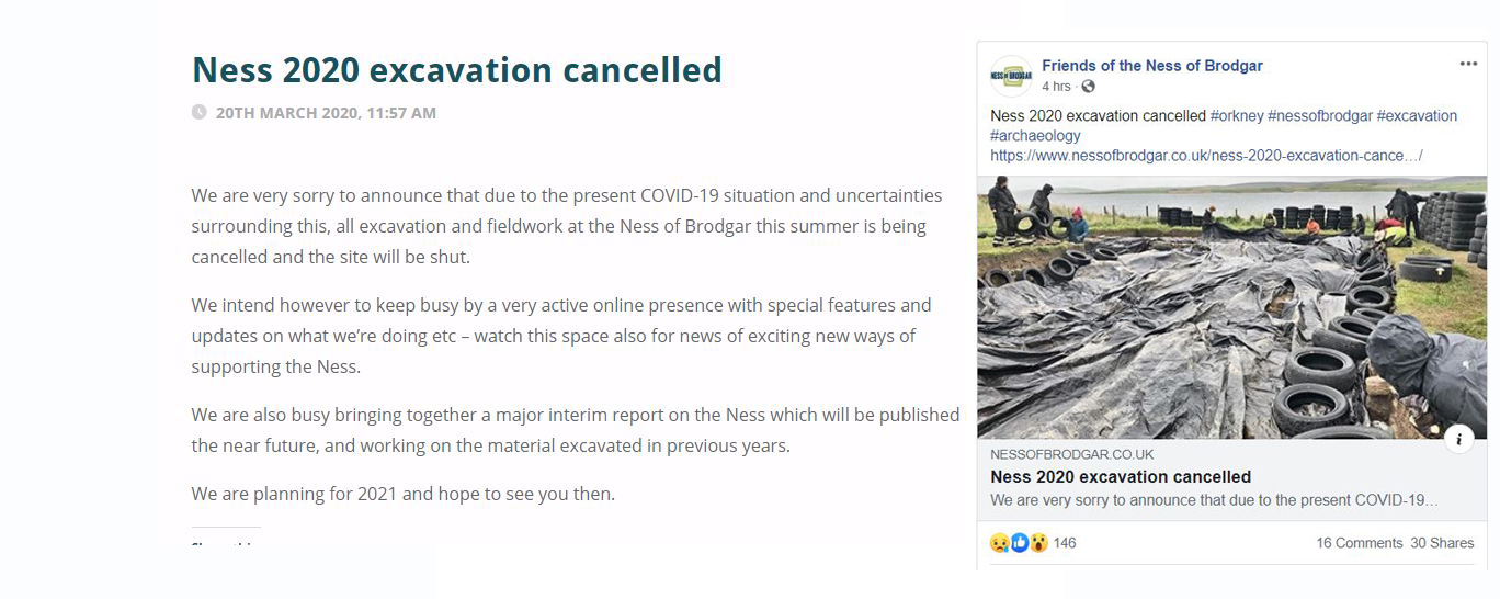 We are very sorry to announce that due to the present COVID-19 situation and uncertainties surrounding this, all excavation and fieldwork at the Ness of Brodgar this summer is being cancelled and the site will be shut.