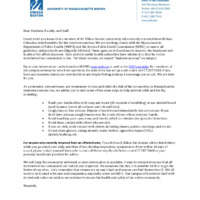 Email from the five chancellors and the president of the University of Massachusetts system and UMass Boston Interim Chancellor Katherine S. Newman announcing the decision to shift to a remote-learning plan in an effort to mitigate the spread of the coronavirus. The email also lays out specific expectations for faculty, staff, and students to prepare for the shift to remote learning and limit the activities of the UMass Boston community.