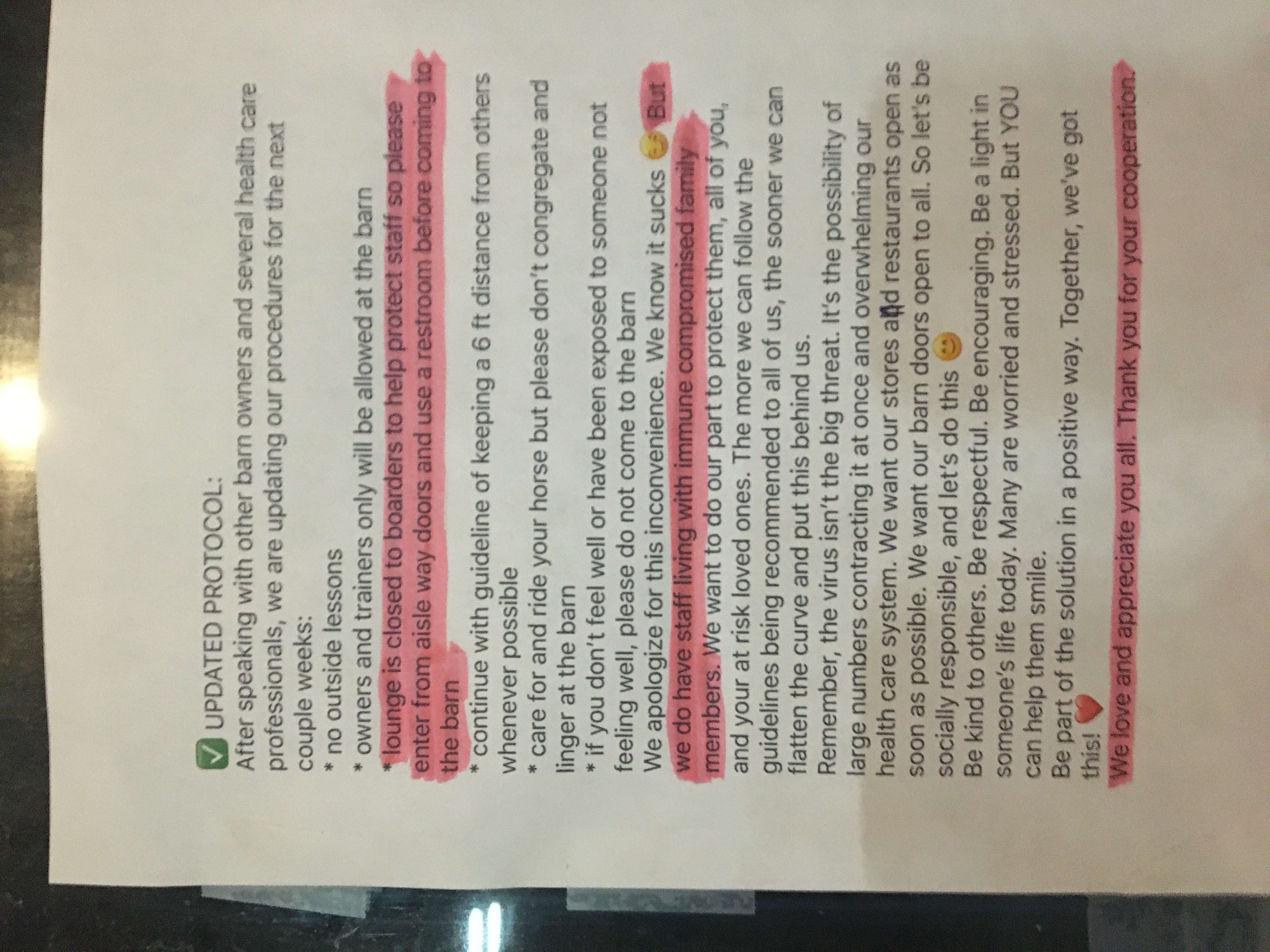 The flyer shows that even places that don’t experience the type of crowding the CDC suggests avoiding are taking significant steps to reduce risk to staff, as well as the ways that risk cannot be eliminated. People need access to their horses to continue to care for them, but that is still risky.