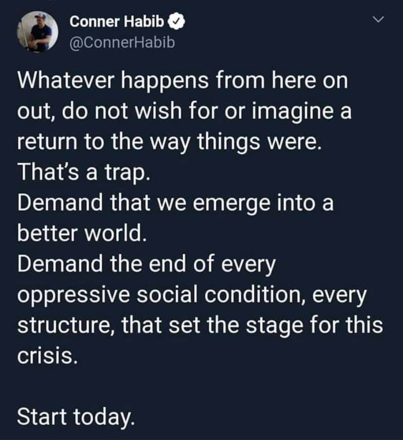 This tweet calls of society to emerge from the pandemic and work to create a better world. Far too many factors allowed for the rise and continued spread of the virus. Society is now facing the consequences of such an intense global crisis, and some of the struggles could have been avoided had appropriate measures been taken, especially in America. Had America had paid sick leave, free health insurance, etc., maybe the spread of the virus could have been slowed. While we will never know, we must do better. We must take what we learn from this and create a better world for all.
