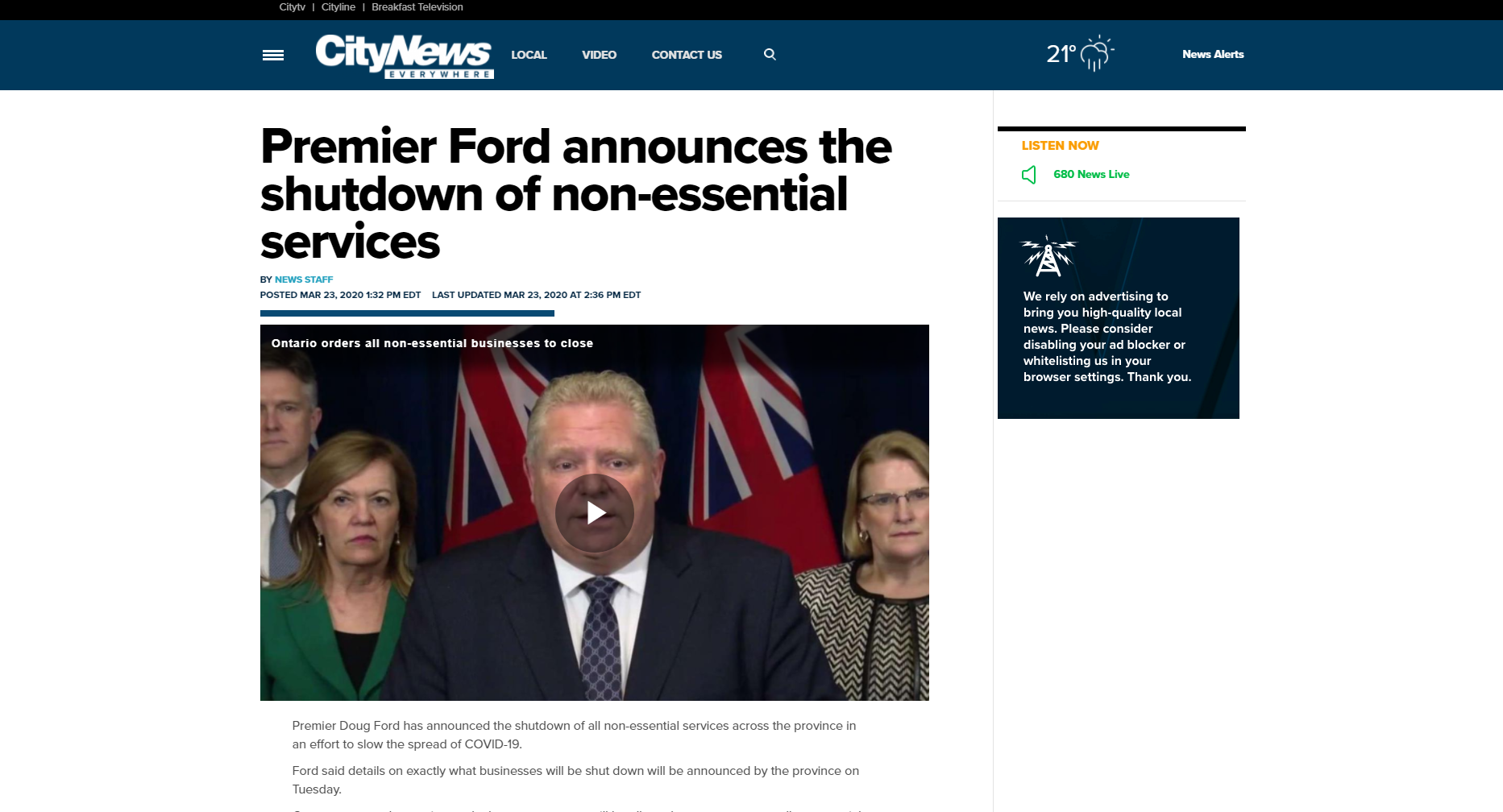 Article and video of Ontario Premier Doug Ford Shutting Ontario down for non-essential services