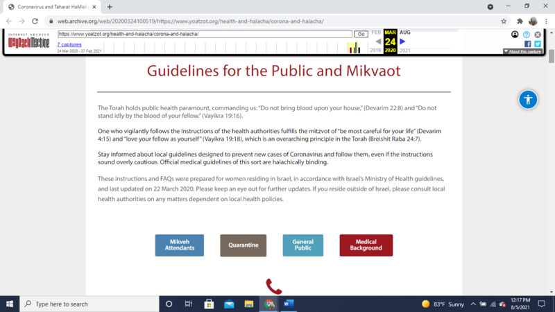 My partner shared an email with me from the Rabbi of a synagogue we're affiliated with, which addressed questions he'd received from congregants about how to deal with family purity laws under the current physical distancing restrictions. The email recommended reviewing the advice on this website, which provides guidelines for Jewish women performing ritual immersion at a mikveh (ritual bath) for the purposes of family purity, and for mikveh attendants, during the coronavirus outbreak. The advice was developed by Jewish women who are revered as experts in this aspect of religious law.