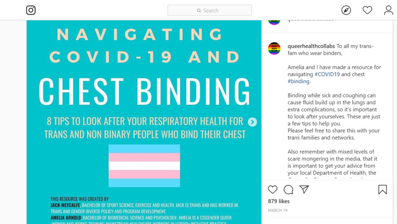 8 tips to look after your respiratory health for trans and non binary people who bind their chest .I am a member of a secret online group for transgender men. A member of the group from the US shared this resource, on how to look after your respiratory health for trans and non binary people who bind their chest. I realised that it was written by a member of the Australian trans community, someone I have connections with in my own city. It felt good to know that resources developed by someone in my own backyard are having a global reach and that the transgender community around the world are pulling together to support one another at this time.