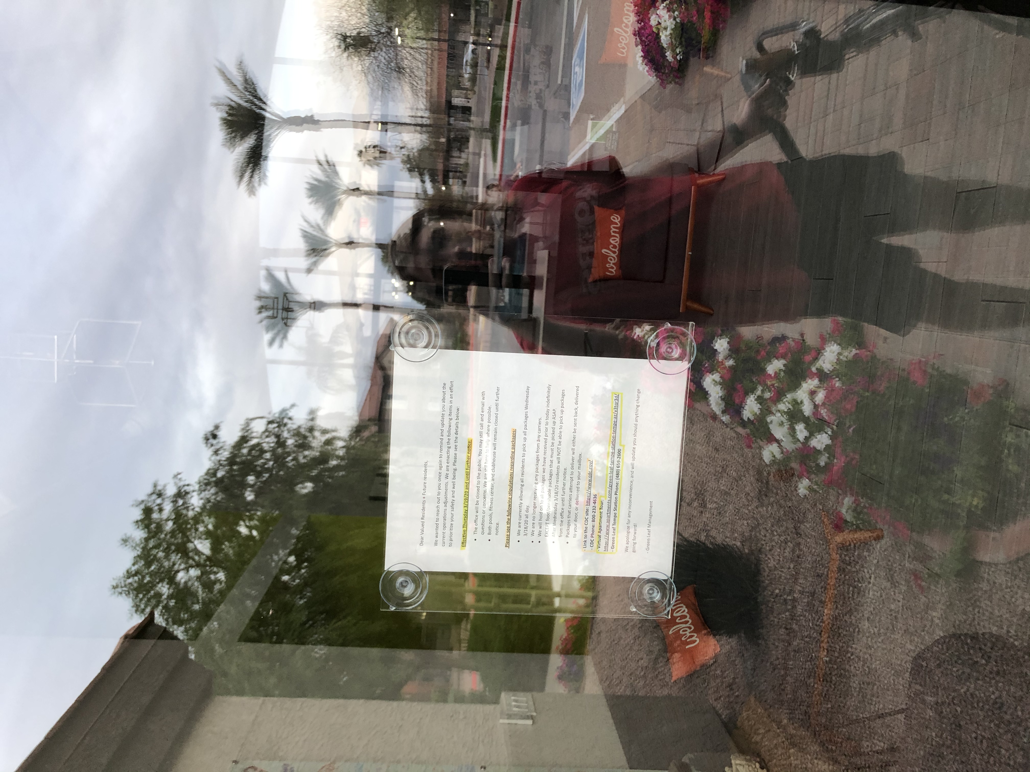 Office has closed to residents and does not accept packages for residents to the front office. The office has asked residents to make sure that deliveries go directly to our front door.