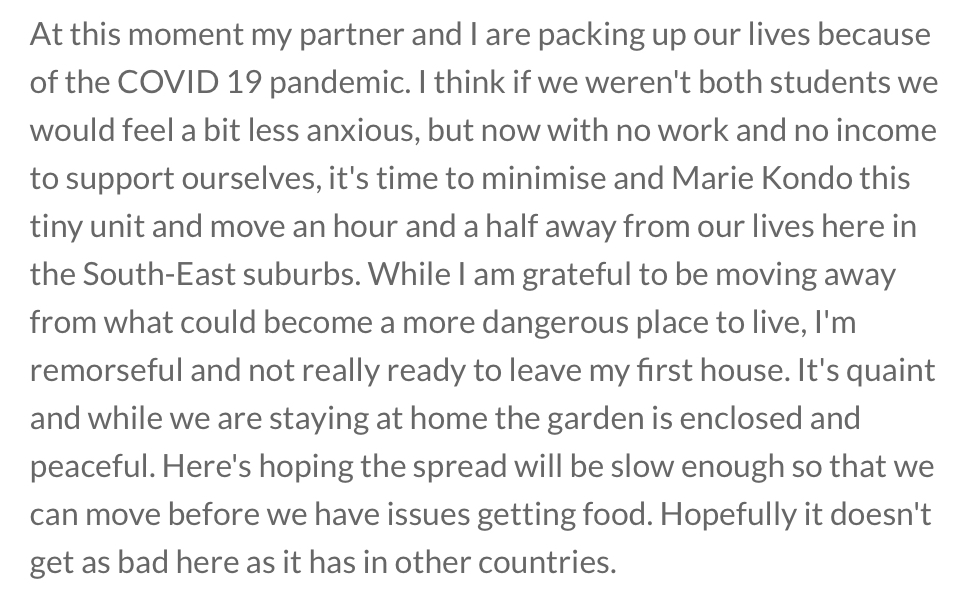 At this moment my partner and I are packing up our lives because of the COVID 19 pandemic. I think if we weren't both students we would feel a bit less anxious, but now with no work and no income to support ourselves, it's time to minimise and Marie Kondo this tiny unit and move an hour and a half away from our lives here in the South-East suburbs. While I am grateful to be moving away from what could become a more dangerous place to live, I'm remorseful and not really ready to leave my first house. It's quaint and while we are staying at home the garden is enclosed and peaceful. Here's hoping the spread will be slow enough so that we can move before we have issues getting food. Hopefully it doesn't get as bad here as it has in other countries.