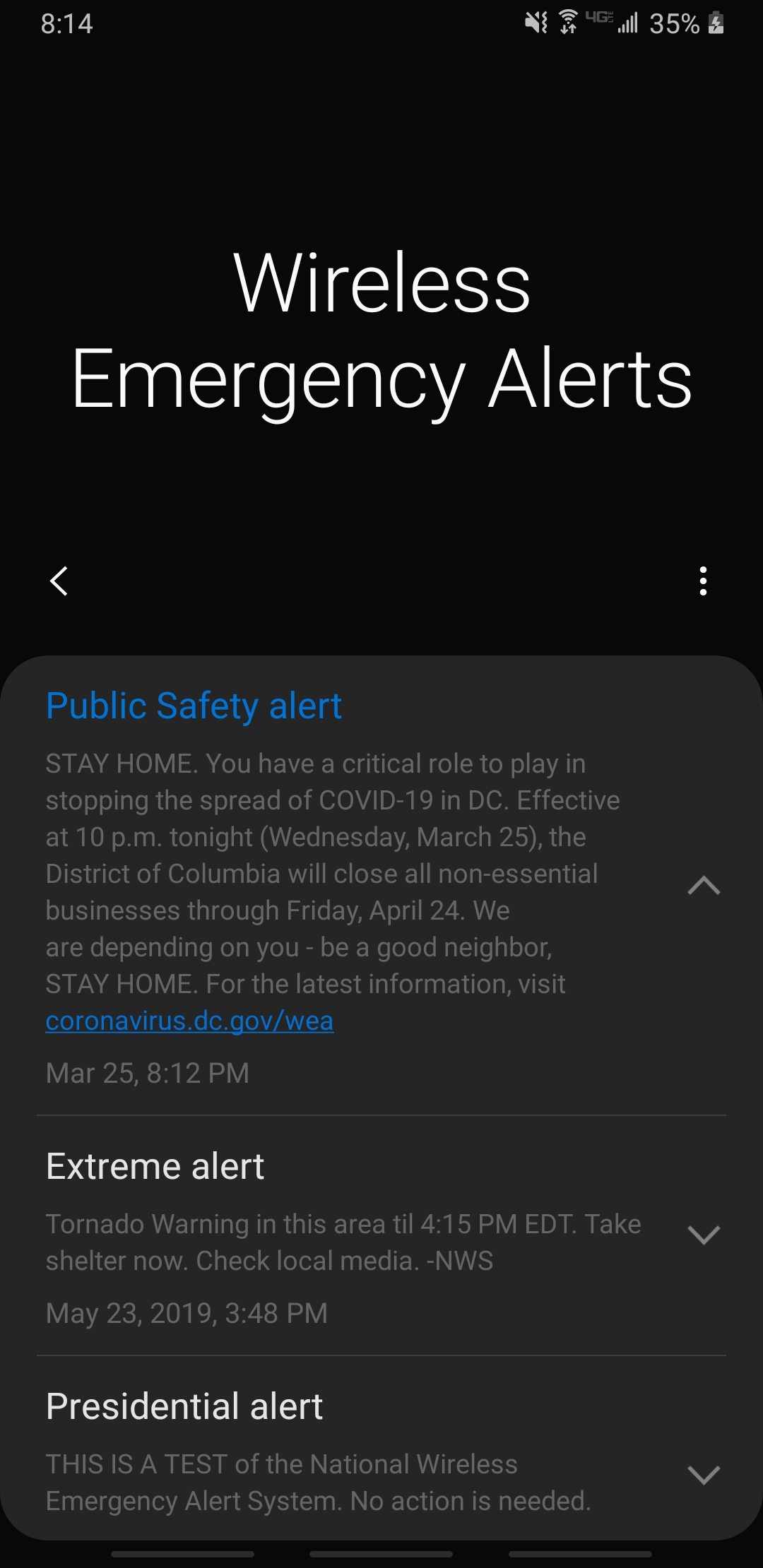 This was a text message pushed out to the cell phones of all DC residents on 3/25/20 at about 8 pm. DC shuts down non essential businesses.