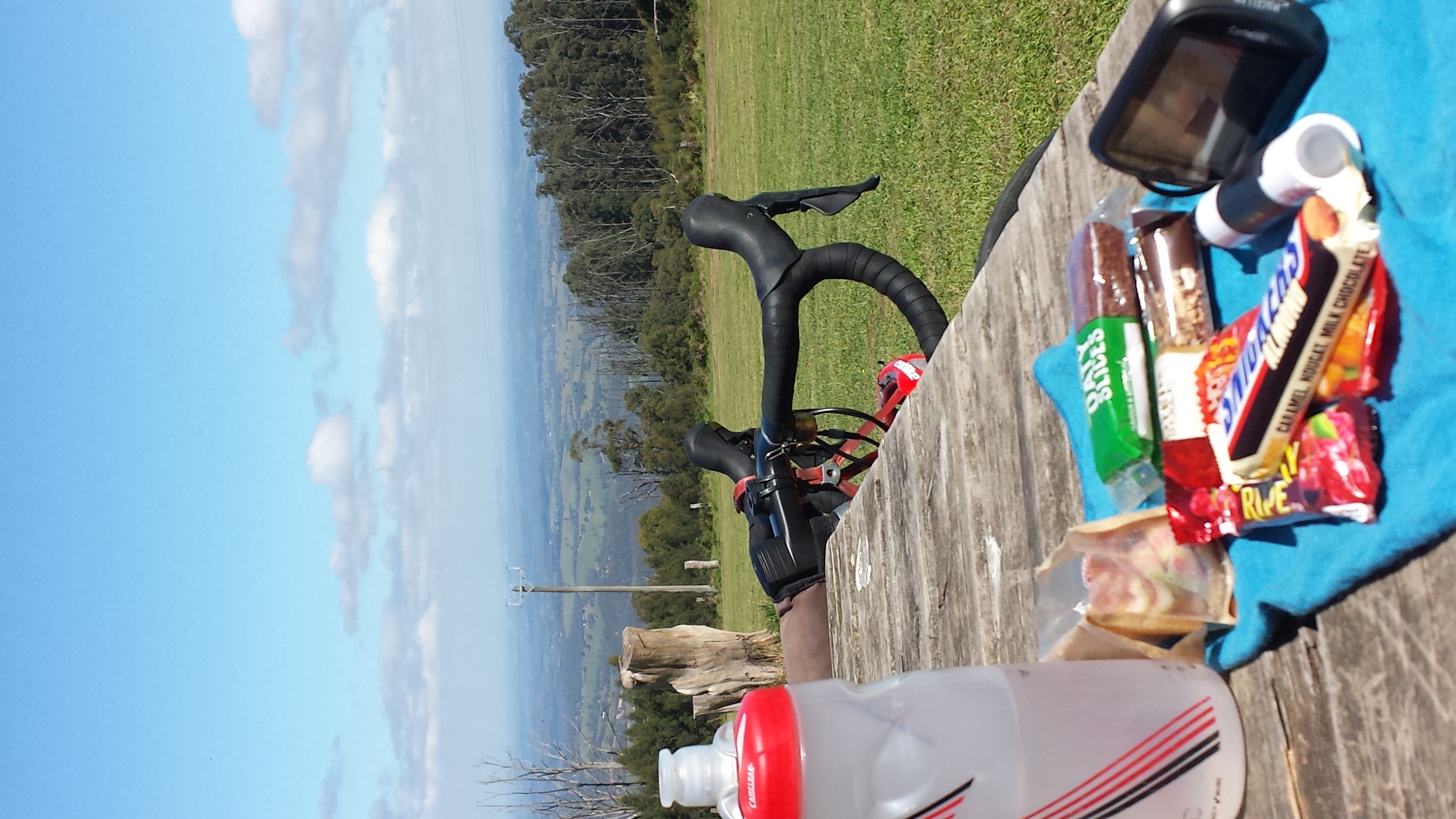 Instead of organised rides in groups and having lunch etc at a cafe, most road cyclists are riding alone. This photo shows a lunch of muesli bars etc on a solo ride. Not shown is the hand sanitiser used to disinfect the tap used to fill water bottles.