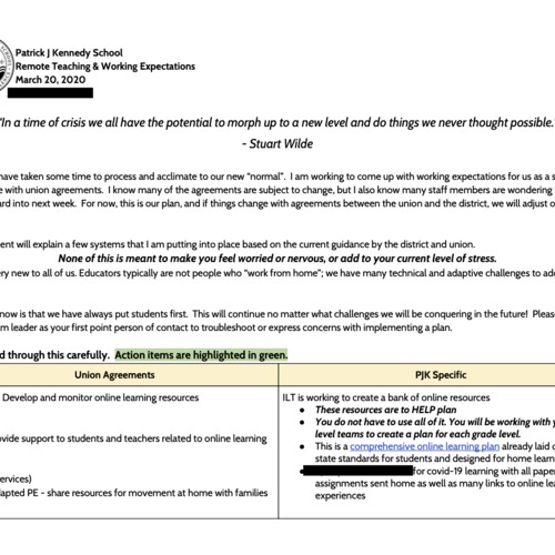 Internal, Shared, Living Document (GoogleDoc) for teachers/staff members of the PJ Kennedy school