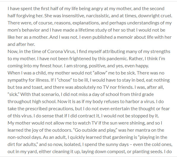 Now, in the time of Corona Virus, I find myself attributing many of my strengths to my mother. I have not been frightened by this pandemic. Rather, I think I’m coming into my finest hour. I am strong, positive, and yes, even happy.