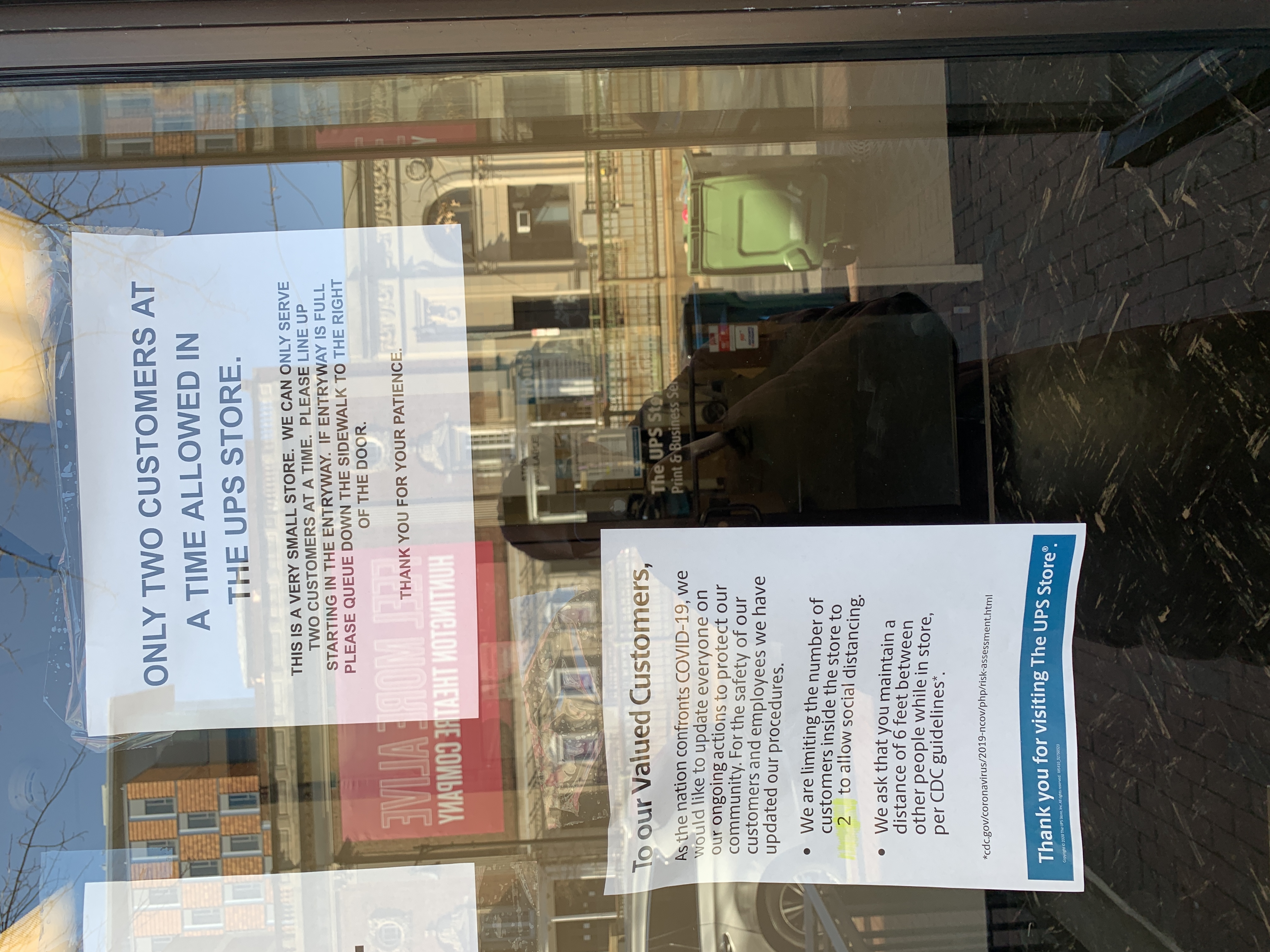 Signs posted on the doors of a UPS Store in Boston, MA. In accordance to CDC guidelines, the store can only serve two customers at a time.