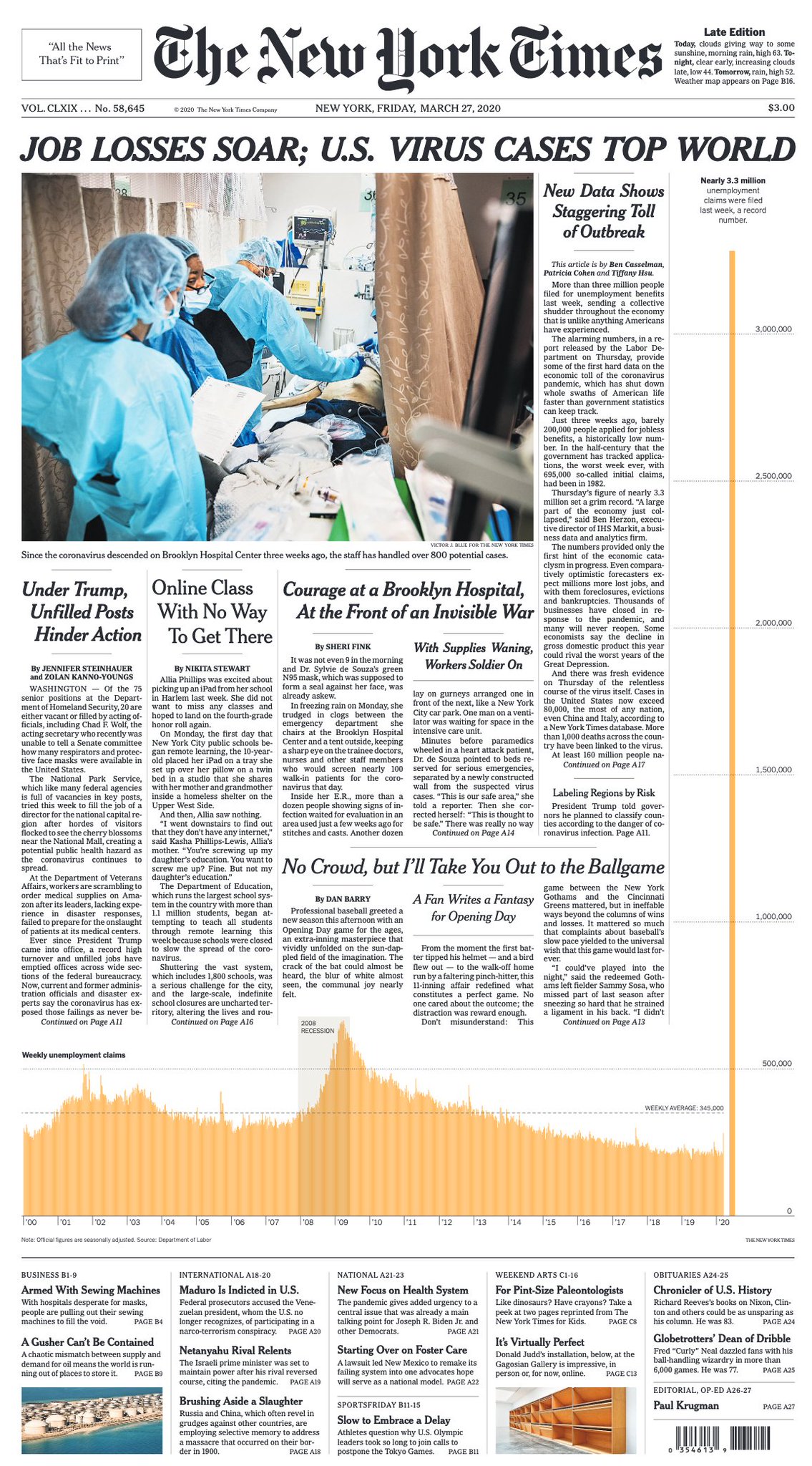 Screenshot of the front page of the New York Times, highlighting the published graph of unemployment claims.