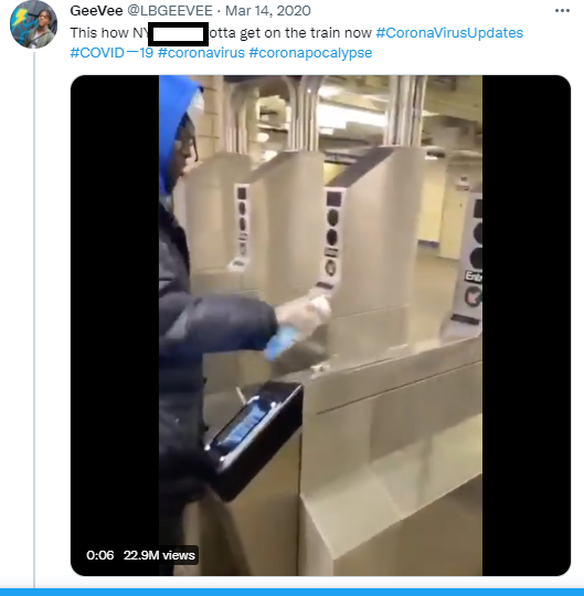 This tweet went viral. It is humorous and it ties together conversations surrounding precautions taken regarding COVID19 and preexisting narratives regarding New York public transit. In 2019 and 2020 New York's MTA began a campaign to stop train fair avoidance that became largely unpopular in the city and was subject to much critique on social media. #HIST5241