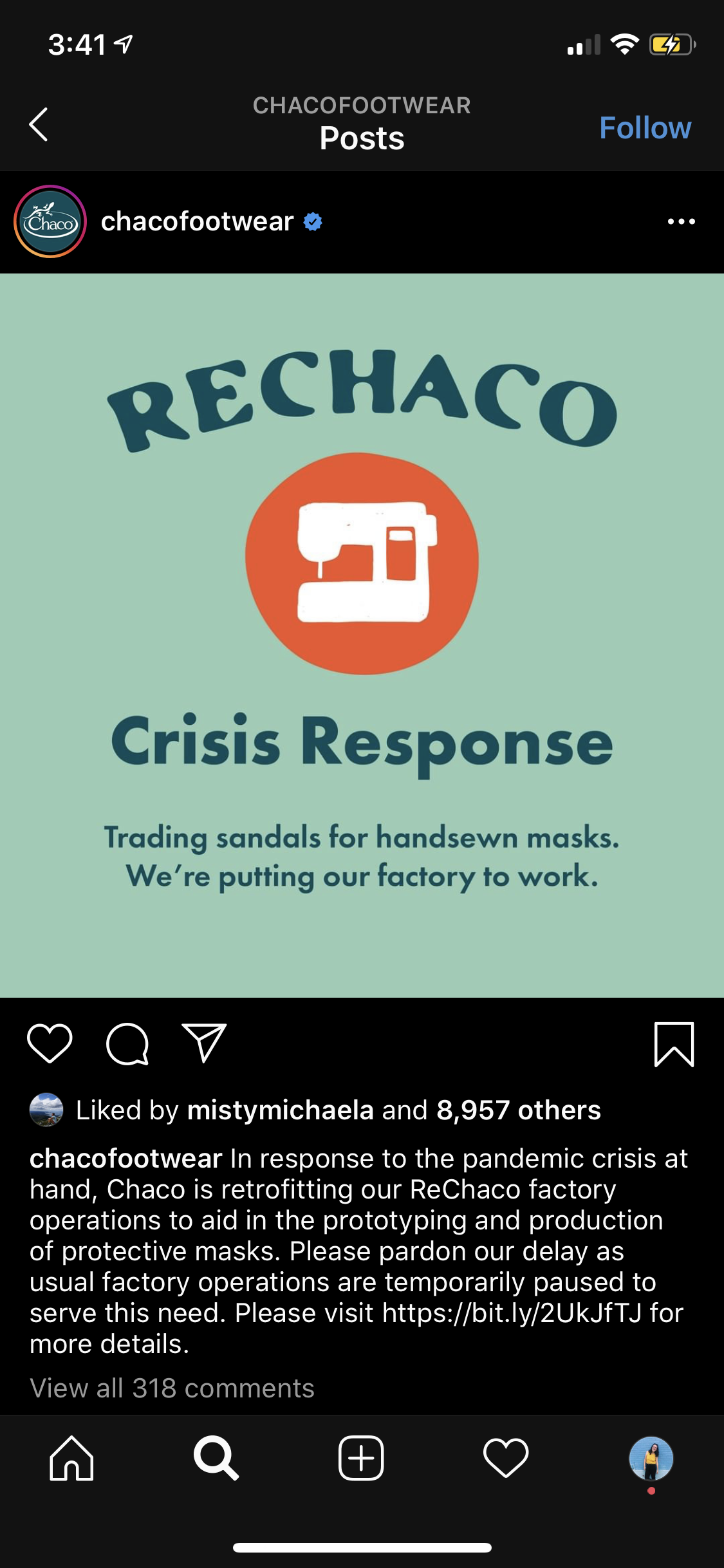Instagram announcement from Chaco Footwear: In response to the pandemic crisis at hand, Chaco is retrofitting our ReChaco factory operations to aid in the prototyping and production of protective masks. #HIST5241