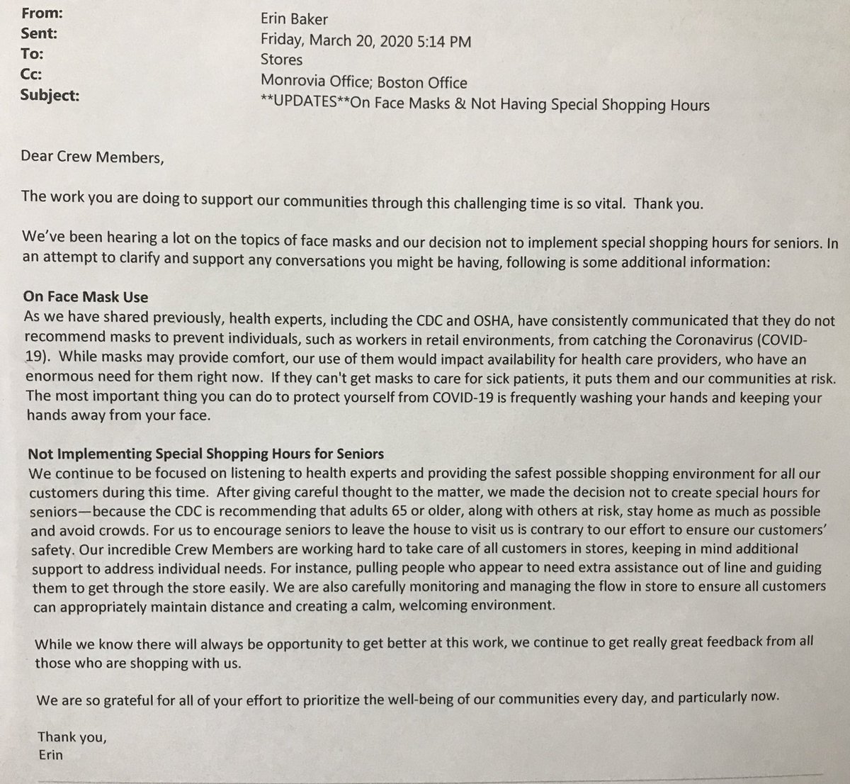 Letter to the staff at Trader Joe's, updating them on how the corporation is planning to handle the crisis
