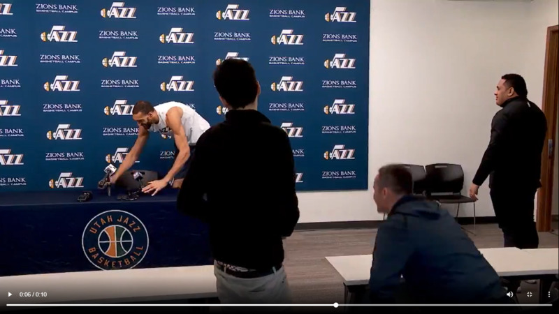 Utah Jazz player Rudy Gobert jokingly touches all the mics in a post-game press conference on 03/11/2020, to make a joke about the Coronavirus. He tested positive for the disease soon after, and the NBA season was suddenly put on hold