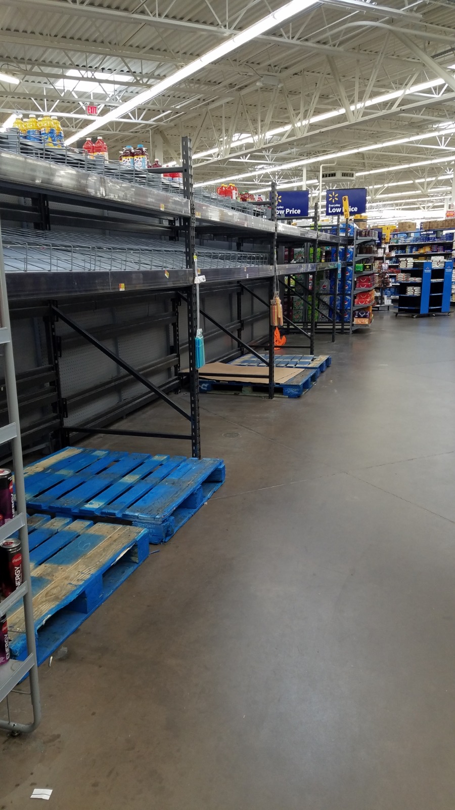 At a Walmart in Fredericksburg, VA, all of the shelves that are usually stocked with water are completely empty. This picture shows that when there is a pandemic, people panic buy which results in shelves staying empty for days and maybe weeks.