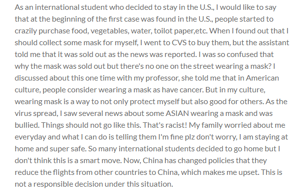 As an international student who decided to stay in the U.S., I would like to say that at the beginning of the first case was found in the U.S., people started to crazily purchase food, vegetables, water, toilot paper,etc. When I found out that I should collect some mask for myself, I went to CVS to buy them, but the assistant told me that it was sold out as the news was reported. I was so confused that why the mask was sold out but there's no one on the street wearing a mask? I discussed about this one time with my professor, she told me that in American culture, people consider wearing a mask as have cancer. But in my culture, wearing mask is a way to not only protect myself but also good for others. As the virus spread, I saw several news about some ASIAN wearing a mask and was bullied. Things should not go like this. That's racist! My family worried about me everyday and what I can do is telling them I'm fine plz don't worry, I am staying at home and super safe. So many international students decided to go home but I don't think this is a smart move. Now, China has changed policies that they reduce the flights from other countries to China, which makes me upset. This is not a responsible decision under this situation.