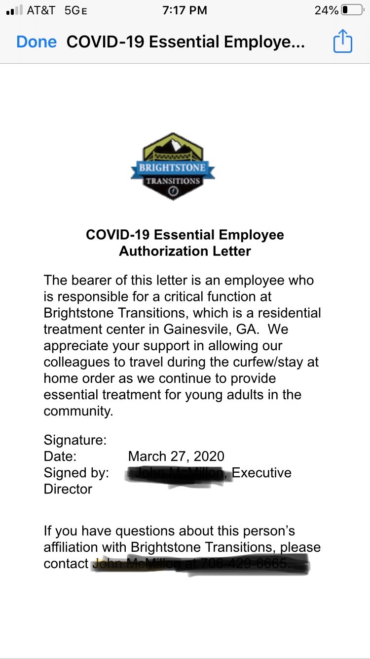 This is an announcement that gives the holder permission to leave their home and go to work, assisting at a young adult transitional program group home.