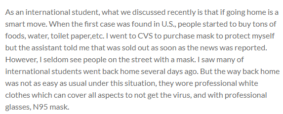 As an international student, what we discussed recently is that if going home is a smart move. When the first case was found in U.S., people started to buy tons of foods, water, toilet paper,etc. I went to CVS to purchase mask to protect myself but the assistant told me that was sold out as soon as the news was reported. However, I seldom see people on the street with a mask. I saw many of international students went back home several days ago. But the way back home was not as easy as usual under this situation, they wore professional white clothes which can cover all aspects to not get the virus, and with professional glasses, N95 mask.