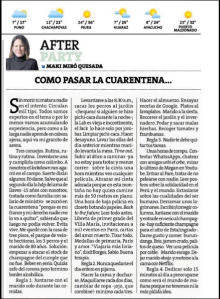 Columnist Maki Miró Quesda published an article on 3/29/2020 calling the family employee an "hdp" for passing the cuarentena with his/her family instead of returning to work in Quesada's home. The article was later deleted from the Peru21 website and an apology issued.