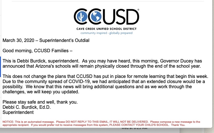 This is an email sent to parents in the Cave Creek Unified School District from Dr. Debbie Burdick announcing that, per Governor Ducey's order, school will not resume for the 2019-2020 school year. She informs families that they were anticipating this, and plans are in place for continuing online education for the remainder of the year.