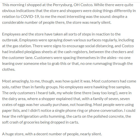 This morning I shopped at the Perrysburg, OH Costco. While there were quite obvious indications that the store and shoppers were doing things differently in relation to COVID-19, to me the most interesting was the sound: despite a considerable number of people there, the store was nearly silent.