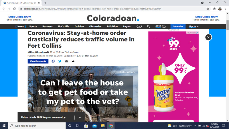 Article from the Colorado on the effect COVID has had on traffic congestion in Fort Collins and Colorado.