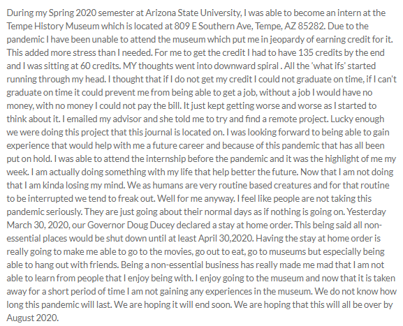 During my Spring 2020 semester at Arizona State University, I was able to become an intern at the Tempe History Museum which is located at 809 E Southern Ave, Tempe, AZ 85282. Due to the pandemic I have been unable to attend the museum which put me in jeopardy of earning credit for it. This added more stress than I needed. For me to get the credit I had to have 135 credits by the end and I was sitting at 60 credits. MY thoughts went into downward spiral . All the 'what ifs' started running through my head. I thought that if I do not get my credit I could not graduate on time, if I can't graduate on time it could prevent me from being able to get a job, without a job I would have no money, with no money I could not pay the bill. It just kept getting worse and worse as I started to think about it. I emailed my advisor and she told me to try and find a remote project. Lucky enough we were doing this project that this journal is located on. I was looking forward to being able to gain experience that would help with me a future career and because of this pandemic that has all been put on hold. I was able to attend the internship before the pandemic and it was the highlight of me my week. I am actually doing something with my life that help better the future. Now that I am not doing that I am kinda losing my mind. We as humans are very routine based creatures and for that routine to be interrupted we tend to freak out. Well for me anyway. I feel like people are not taking this pandemic seriously. They are just going about their normal days as if nothing is going on. Yesterday March 30, 2020, our Governor Doug Ducey declared a stay at home order. This being said all non-essential places would be shut down until at least April 30,2020. Having the stay at home order is really going to make me able to go to the movies, go out to eat, go to museums but especially being able to hang out with friends. Being a non-essential business has really made me mad that I am not able to learn from people that I enjoy being with. I enjoy going to the museum and now that it is taken away for a short period of time I am not gaining any experiences in the museum. We do not know how long this pandemic will last. We are hoping it will end soon. We are hoping that this will all be over by August 2020.