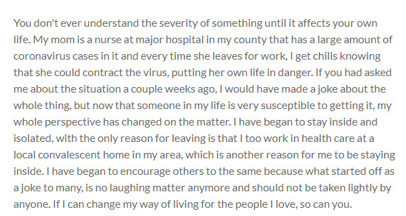 You don't ever understand the severity of something until it affects your own life. My mom is a nurse at major hospital in my county that has a large amount of coronavirus cases in it and every time she leaves for work, I get chills knowing that she could contract the virus, putting her own life in danger. If you had asked me about the situation a couple weeks ago, I would have made a joke about the whole thing, but now that someone in my life is very susceptible to getting it, my whole perspective has changed on the matter. I have began to stay inside and isolated, with the only reason for leaving is that I too work in health care at a local convalescent home in my area, which is another reason for me to be staying inside. I have began to encourage others to the same because what started off as a joke to many, is no laughing matter anymore and should not be taken lightly by anyone. If I can change my way of living for the people I love, so can you.