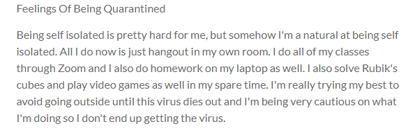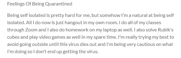 Being self isolated is pretty hard for me, but somehow I'm a natural at being self isolated. All I do now is just hangout in my own room. I do all of my classes through Zoom and I also do homework on my laptop as well. I also solve Rubik's cubes and play video games as well in my spare time. I'm really trying my best to avoid going outside until this virus dies out and I'm being very cautious on what I'm doing so I don't end up getting the virus.