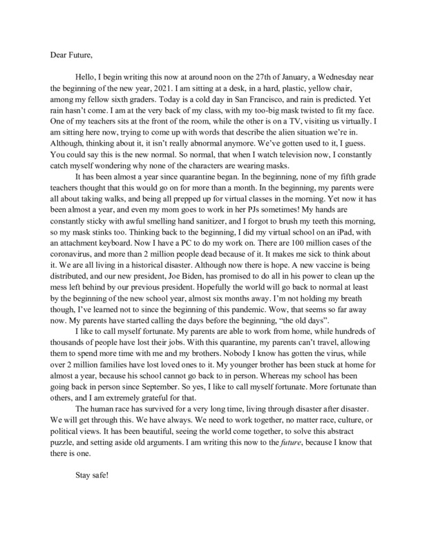 This is the assignment given to my high school juniors at GGHS in Southern California to reflect on their semester of quarantine. Assignments with the #gghsapush and #GGHS hashtags should be related to this assignment. GGHS serves approximately 2400 students, and has an approximate demographic breakdown of: 50% Latino, 39% Asian, 7% White, and 4% other. 66% of the student body is identified as socio-economically disadvantaged, and 23% are identified as English Learners. The school has been on Distance Learning since March 16, 2020.