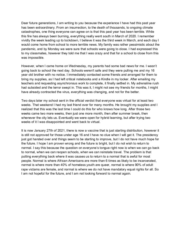 This story tells about the experience of one young person during the pandemic, and their perspective on the future. I wanted to include this to highlight the perspective of young people, and especially to highlight how I am not satisfied with just going back to normal.