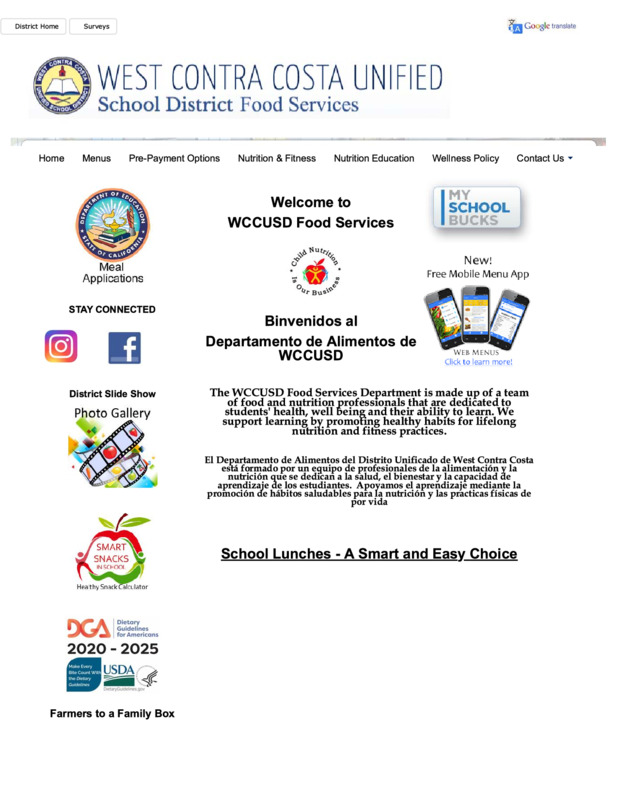 This is an example of what many schools in California are doing for children and families during stay-at-home orders of the pandemic, as part of efforts of the US Department of Agriculture. Many families face food scarcity issues and the meals provided at school are sometimes the only source of food during the day for students. During the pandemic, many children will face food scarcity issues if they do not attend school in person. This school district has organized meal boxes that provide breakfast, lunch, dinner, and snack. The website provides the pickup information in both English and Spanish to meet the communication needs of the families in their district, and stresses the importance of food for students' health and well-being.