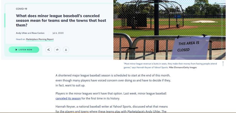 The article from the screenshot is about the Major league Baseball minor league cancelling their 2020 season and the economic impact that it had on the team's ownership (most of which are mom and pop owners) and the city's and towns that host these teams. With the cancelled season, these places and people were not receiving any revenues, and in many cases, these games were a major source for the money coming in. The athletes themselves were still paid, but did not play. This may impact the future of the game in unknown ways. Some of the things that are important for these athletes is that they continuously play which keeps their skills up as well as their physical condition, but most importantly, it allows for the teams to see their talent and promote them to the "big leagues." With the 2021 minor league season in jeopardy, the future of the game is in question.