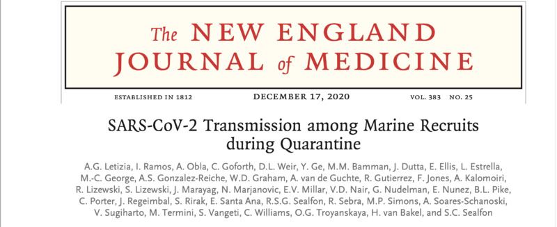 This is an academic article that discusses the transmission of Covid-19 among Marine recruits in quarantine. Due to the pandemic, recruits have been forced to quarantine before they were able to begin their basic training. Marines were sent to a college campus where they practiced social distancing for two weeks before going to training. This study shows the effectiveness of quarantining, social distancing, and mask-wearing